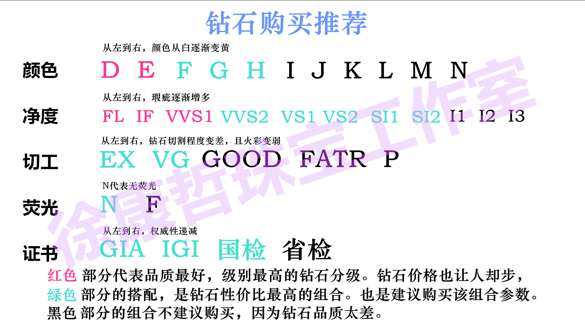 美国珠宝学院GIA对于钻石颜色等级有以下分级:D(极白色+)、E(极白)、F(很白+)、