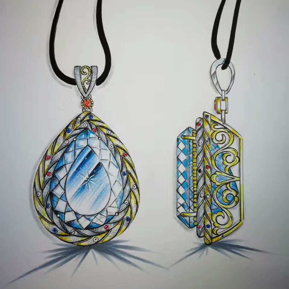 说明:主石为海蓝宝石,副石为钻石、蓝宝石、碧玺以及红宝石。